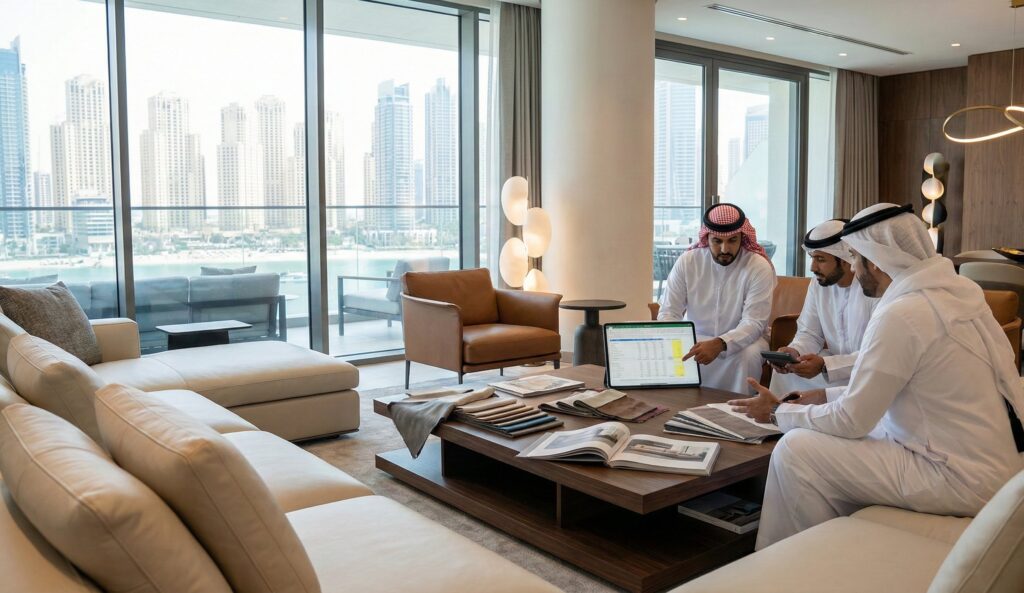 FF&E procurement extends beyond furniture to include lighting fixtures (10-15% of furniture budget), window treatments (5-8%), accessories and art (8-12%), and custom millwork (15-25%). A comprehensive AED 1,000,000 allocation distributes approximately: furniture AED 650,000-700,000, lighting AED 100,000-120,000, window treatments AED 60,000-80,000, accessories AED 80,000-100,000, millwork AED 110,000-170,000.