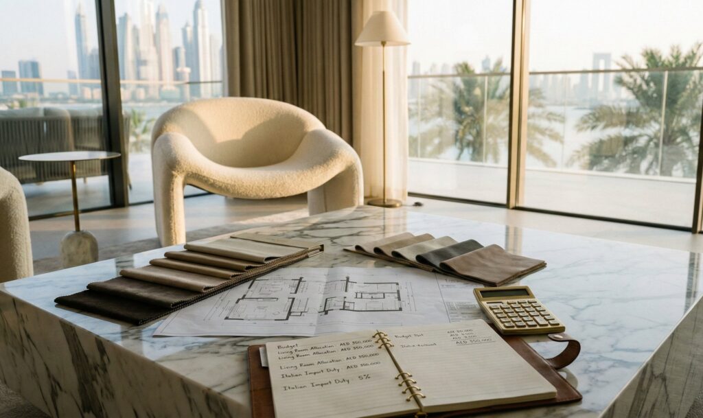 Italian core with strategic supplements: Recommended approach concentrates Italian procurement in visible, high-impact zones (living, dining, master bedroom) while sourcing secondary spaces from design-compatible alternatives. Budget breakdown for AED 1,000,000 total: