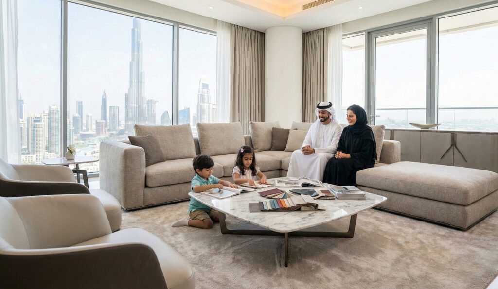 - Living room (35% of furniture budget): Durable Italian or Italian-style leather sectionals, performance fabric upholstery, cleanable surfaces. Brands like Natuzzi and Nicoletti offer commercial-grade residential collections. Budget: AED 105,000-140,000 of AED 400,000 total.